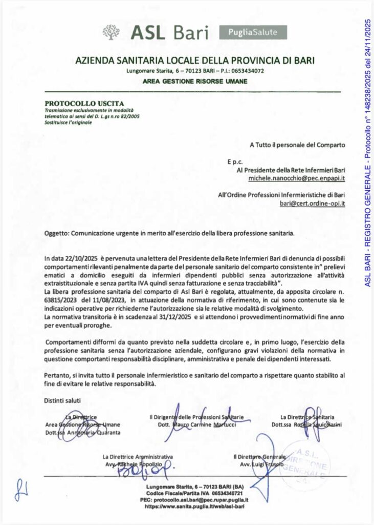 L’Asl Bari ha inviato una comunicazione ufficiale – Protocollo n. 148238/2025 (24/11/2025) – a tutto il personale del comparto per richiamare l’attenzione sulla corretta gestione della libera professione sanitaria. La nota, comunicata internamente e indirizzata anche a Rete Infermieri Bari e Opi Bari, segnala denunce di prelievi ematici domiciliari effettuati senza autorizzazione aziendale e senza tracciabilità fiscale.