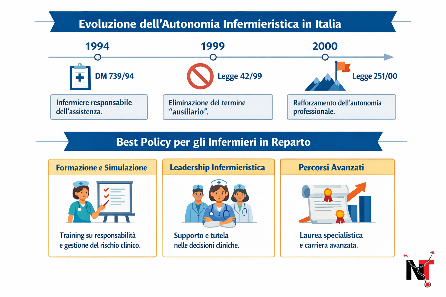 A livello normativo il riconoscimento formale dell’infermiere come professionista sanitario è sancito da più provvedimenti: la Legge n. 42/1999 che ha ridefinito le professioni sanitarie; il D.M. 14 settembre 1994, n. 739 che individua il profilo professionale dell’infermiere; e la Legge 10 agosto 2000, n. 251 che disciplina le professioni sanitarie e rafforza i livelli di autonomia.