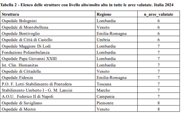 Il rapporto valuta complessivamente 1.117 strutture di ricovero, pubbliche e private, sulla base di 218 indicatori. Le aree cliniche considerate sono otto: cardiocircolatorio, nervoso, respiratorio, chirurgia generale, chirurgia oncologica, gravidanza e parto, osteomuscolare, nefrologia. Dall’analisi emerge che sono 15 le strutture ospedaliere al top, ovvero quelle che valutate su almeno 6 aree cliniche su un totale di 8 hanno raggiunto nel 2024 un livello “alto” o “molto alto”.