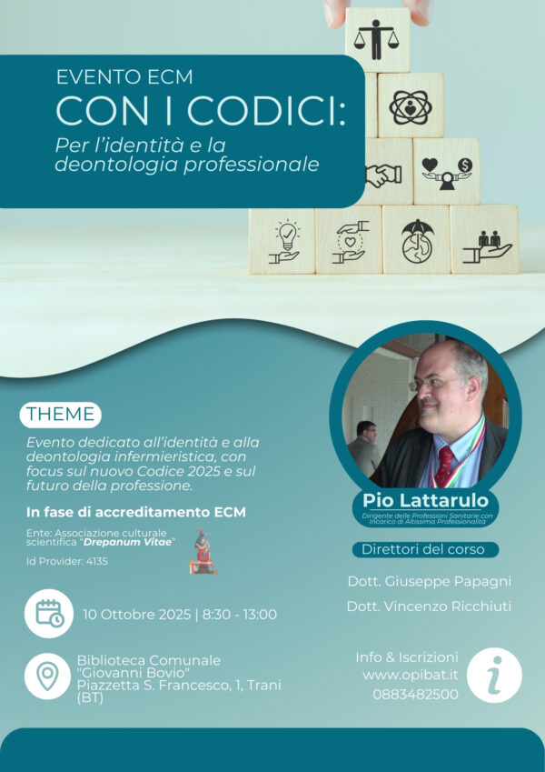 Opi BAT (Barletta-Andria-Trani) è lieto di presentare il seminario formativo “CON I CODICI – per l’identità e la deontologia professionale”, un incontro dedicato alla riflessione sull’identità personale e professionale dell’infermiere e al ruolo centrale dei codici di deontologia nella pratica quotidiana. L’evento si terrà a Trani, Biblioteca Comunale, Piazzetta San Francesco 1, il 10 ottobre 2025.