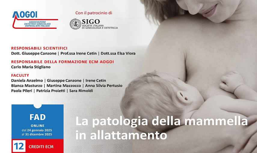 L’Associazione ostetrici ginecologi ospedalieri italiani (Aogoi) promuove il corso Ecm Fad gratuito “Patologia della mammella in allattamento”, attivo fino al 31 dicembre 2025. L’evento formativo, che attribuisce 12 crediti Ecm, è destinato a medici chirurghi (medicina interna, pediatria, chirurgia generale, chirurgia toracica, ginecologia e ostetricia, anestesia e rianimazione, radiodiagnostica, medicina generale), infermieri, infermieri pediatrici, biologi, assistenti sanitari, ostetrici, tecnico sanitari di laboratorio biomedico.