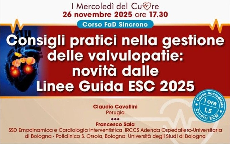 Oggi, mercoledì 26 novembre alle 17:30, è in programma il nuovo corso Fad gratuito “Consigli pratici nella gestione delle valvulopatie: novità dalle linee guida ESC 2025”, realizzato da Clinical Learning in collaborazione con CardioTalk, nell’ambito della collana “I Mercoledì del Cuore”. L’evento formativo consente l’acquisizione di 1,5 crediti Ecm.