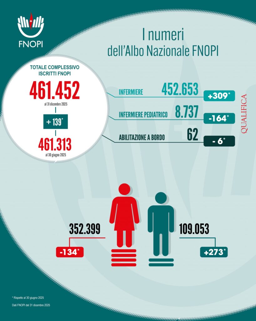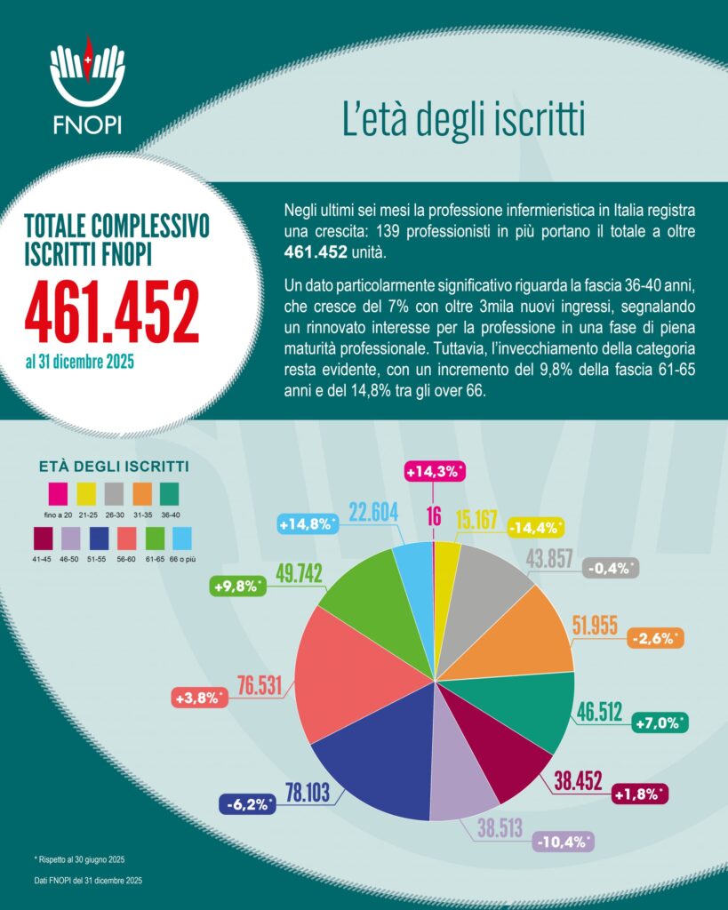 In questo primo rilascio del 2026 l’attenzione si concentra sul numero degli iscritti al 31 dicembre 2025. In particolare, mette in evidenza cosa è cambiato in questi mesi in termini di presenza numerica, di età e quindi delle generazioni che compongono la comunità infermieristica. Negli ultimi sei mesi la professione infermieristica in Italia registra una crescita modesta. Nel saldo tra nuovi iscritti e cancellazioni: 139 professionisti in più portano il totale a 461.452 unità.