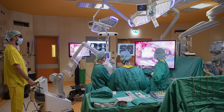 Utilizzato innovativo esoscopio per la nuova chirurgia di precisione che ha facilitato un delicato intervento di rimozione di un esteso tumore cerebrale in una donna di 40 anni
