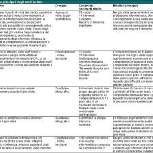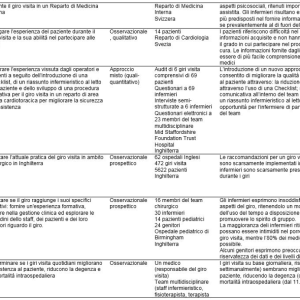 Le tempistiche piuttosto brevi entro le quali viene condotto il giro visita, molto spesso producono discrepanze nella documentazione tra le informazioni fornite al paziente e la gestione dei loro piani di assistenza e inoltre, molte informazioni importanti possono essere perse, con un impatto negativo sulla sicurezza dei pazienti (Gilliand et al. 2018). Per questo motivo, riuscire ad avere una visione esaustiva dell’argomento potrebbe contribuire a fornire spunti di riflessione per sensibilizzare gli operatori ed i manager sanitari su questo importante tema, al fine di suggerire delle strategie di miglioramento attraverso l’implementazione di un giro visita appositamente strutturato in base alle esigenze peculiari di ciascun reparto e che sia in grado di dimostrare la sua efficacia. L’obiettivo della revisione è effettuare una rassegna degli studi disponibili inerenti il giro visita multidisciplinare come prassi per garantire la qualità, per comprendere il contributo e la posizione della professione infermieristica in questo ambito. Nello specifico, le domande di ricerca che hanno guidato la revisione sono: