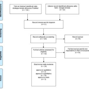 La ricerca bibliografica iniziale ha permesso di identificare 665 articoli rilevanti per gli obiettivi della revisione; è stato successivamente effettuato uno screening di 166 titoli e abstract e di questi, sono stati considerati eleggibili per la revisione 42 articoli integrali (full text). Complessivamente, sono stati inclusi nella revisione finale 24 articoli (18 esclusi poiché non rispondevano alle domande guida della revisione); di questi, tre studi hanno un approccio alla ricerca di tipo qualitativo, tre si basano su un approccio misto, 18 di tipo quantitativo; tutti sono in lingua inglese. I risultati della fase di selezione degli articoli sono stati sintetizzati utilizzando gli Item del PRISMA Statement (Mother, Liberati, Tetslaff e Altman, 2009) (Figura. 3).