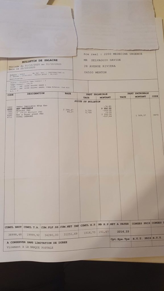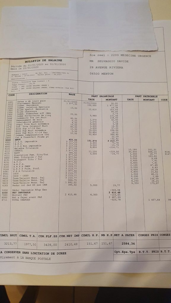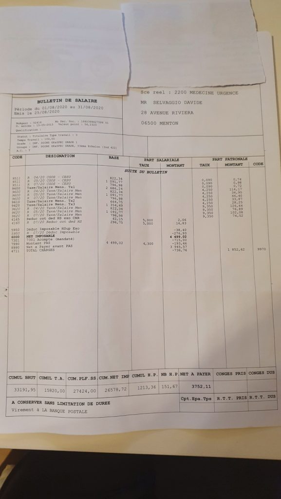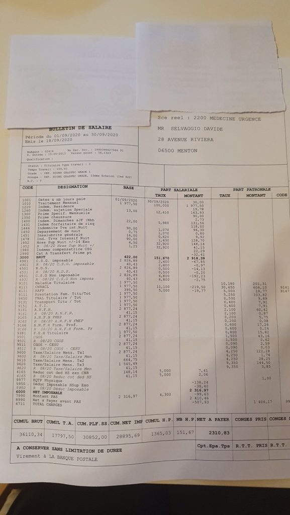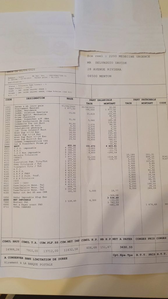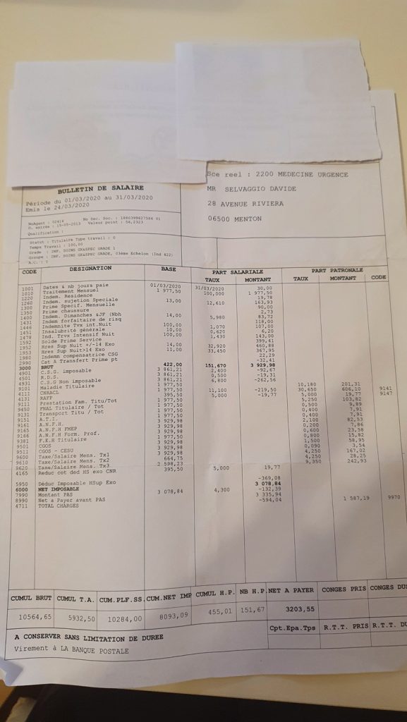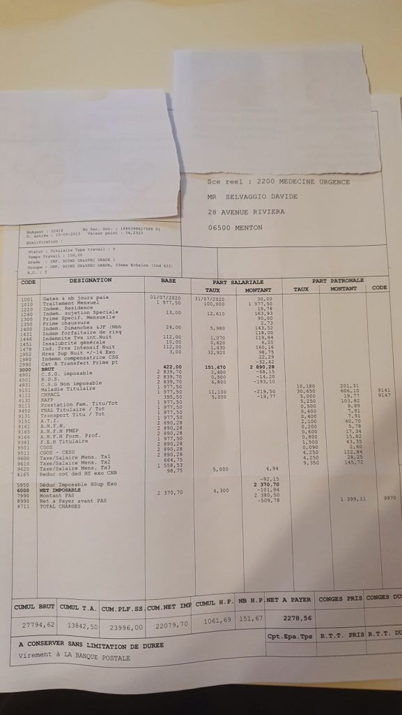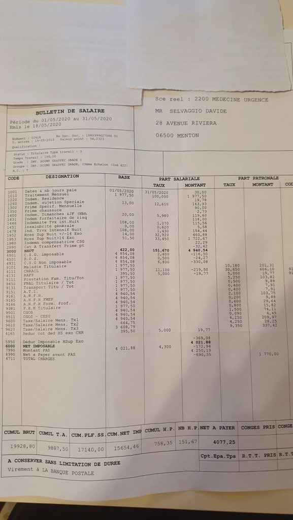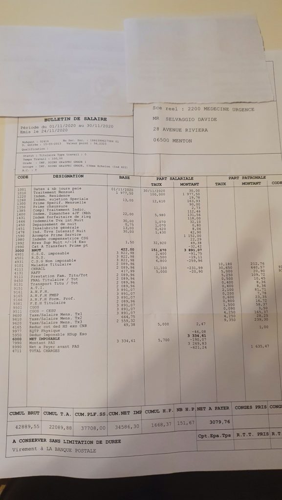 Vi allego le mie buste paga del 2020, in cui ho volutamente reso anonimo l’opsedale presso cui lavoro, che è in ogni caso un ospedale pubblico del sud della Francia, in oltre vi invito a non pubblicare mai le medesime foto, in quanto vorrei restare anonimo nella mia denuncia.