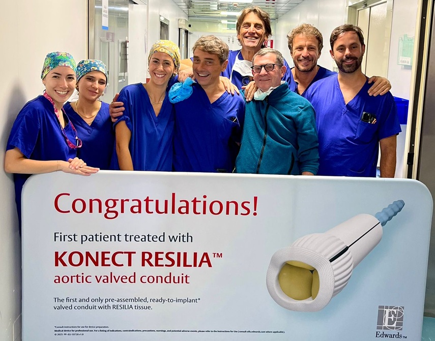 La procedura di intervento ha previsto l’impianto del dispositivo KONECT RESILIA, prima soluzione pronta per l’impianto disponibile in Europa per le procedure bio-Bentall. Si tratta di un condotto aortico avanzato, già assemblato, che semplifica la sostituzione completa della radice aortica con valvola biologica integrata.