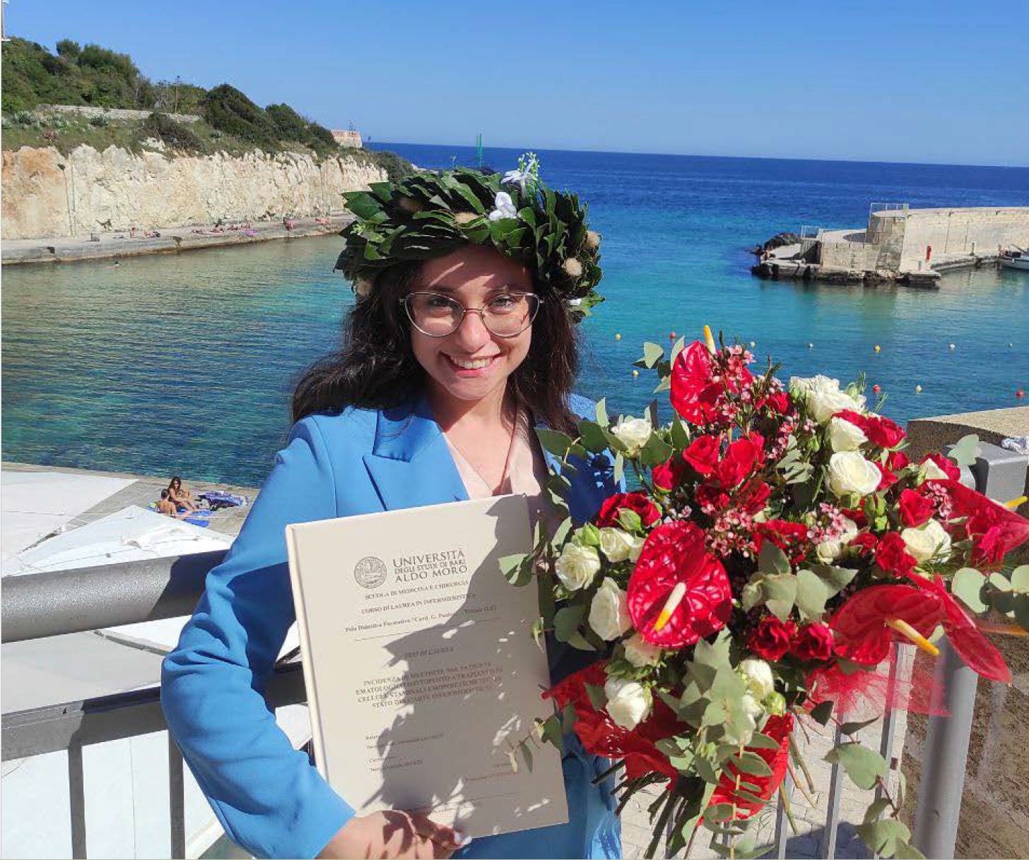 sono la dott.ssa Francesca Guerriero., ho conseguito la Laurea in Infermieristica lo scorso Aprile 2024 presso l’Università degli Studi di Bari “Aldo Moro”, sede distaccata di Tricase (Le) (Ospedale Card. Panico). Ho condotto una Tesi Sperimentale dal titolo “Incidenza di mucosite nel paziente ematologico sottoposto a trapianto di cellule staminali emopoietiche (TCSE): stato dell’arte infermieristico”.