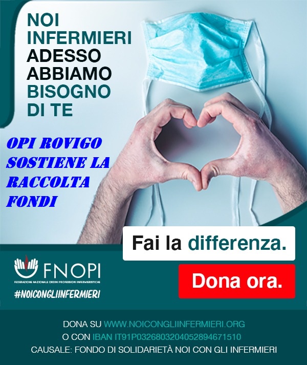 L’OPI di Rovigo, assieme agli altri Ordini veneti, ha aderito al Fondo di solidarietà #NoiConGliInfermieri attraverso le tre campagne principali. Nello specifico, gli Ordini del Veneto hanno devoluto 2.500 euro alla campagna “Una vita per la vita” destinata alle famiglie degli infermieri deceduti; 2.250 euro alla campagna “Lontani ma soli” dedicata al sostegno degli infermieri in quarantena costretti ad abbandonare i propri cari e 2.250 euro alla campagna “Tornare alla normalità” rivolta a sostenere gli infermieri nel processo di cura e riabilitazione.Numerosi, a livello nazionale, i personaggi dello sport, della cultura, del cinema e della musica che hanno aderito alla campagna di raccolta fondi la quale può essere sostenuta da chiunque accedendo al portale dedicato alle donazioni www.noicongliinfermieri.org.
