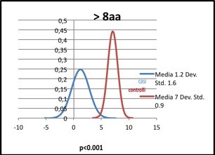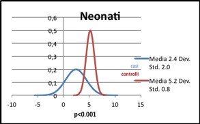 Nei grafici 1, 2, 3 e 4 vengono messi a confronto i valori delle medie e delle relative deviazioni standard nei casi rispetto ai controlli nelle varie fasce di età, riportando altresì il valore del parametro “p” che è sempre inferiore a 0,001, esprimendo, in tal modo, una forte relazione statisticamente significativa tra l’uso di tecniche di prevenzione del dolore (somministrazione di glucosata nel neonato ed applicazione cutanea di prilocaina e lidocaina nei bambini) e la valutazione quantitativa del dolore indotto dalle procedure infermieristiche in tutte e 4 le fasce di età.
