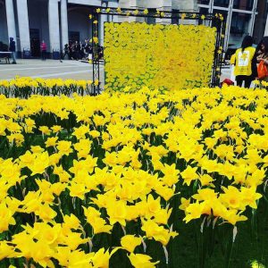 L’opera è composta da 2100 narcisi è stato realizzato: ciascun narciso rappresenta un infermiere dell’ente Marie Curie e simboleggia la loro dedizione nel “portare luce nelle ore più buie.