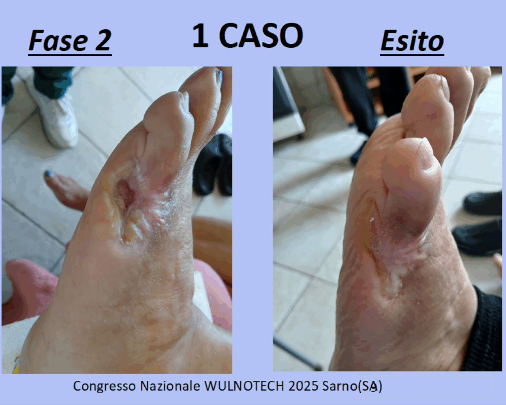 Il primo caso è la paziente diabetica di anni 65, presa in carico per il trattamento degli esiti di amputazione del quinto dito del piede sinistro in seguito di gangrena collegata ad angiopatia degli arti inferiori e la compromissione del circolo arterioso.