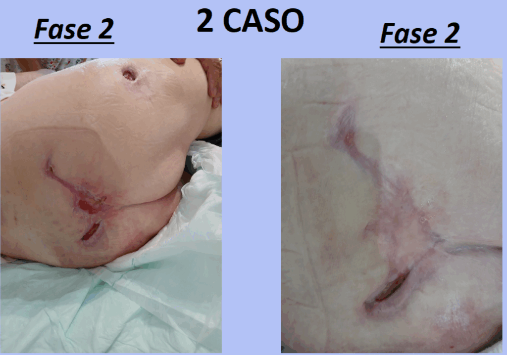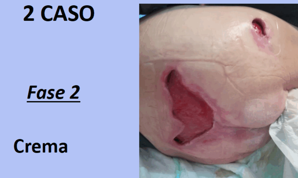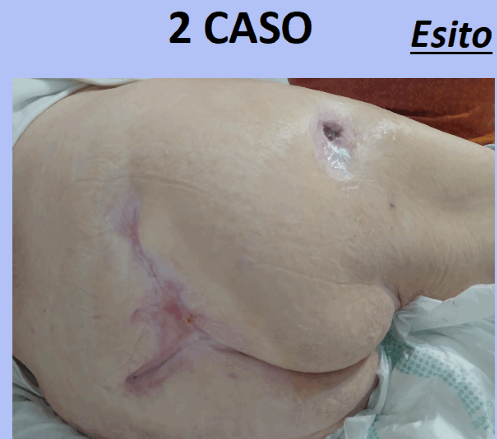 Il secondo caso è una paziente di anni 94 con la demenza senile e la sindrome di allettamento, presa in carico per il trattamento della lesione da pressione di IV stadio nella zona sacrale ed un’altra lezione sul trocantere destro sempre di IV stadio.