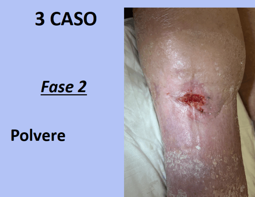 Siccome questa ferita era caratterizzata dall’essudato bel abbondante è stata scelta la polvere con l’ialuronato di sodio ed aminoacidi essenziali per il procedimento verso la riepitelizzazione. Due mesi dopo la lesione eracompletamente guarita.