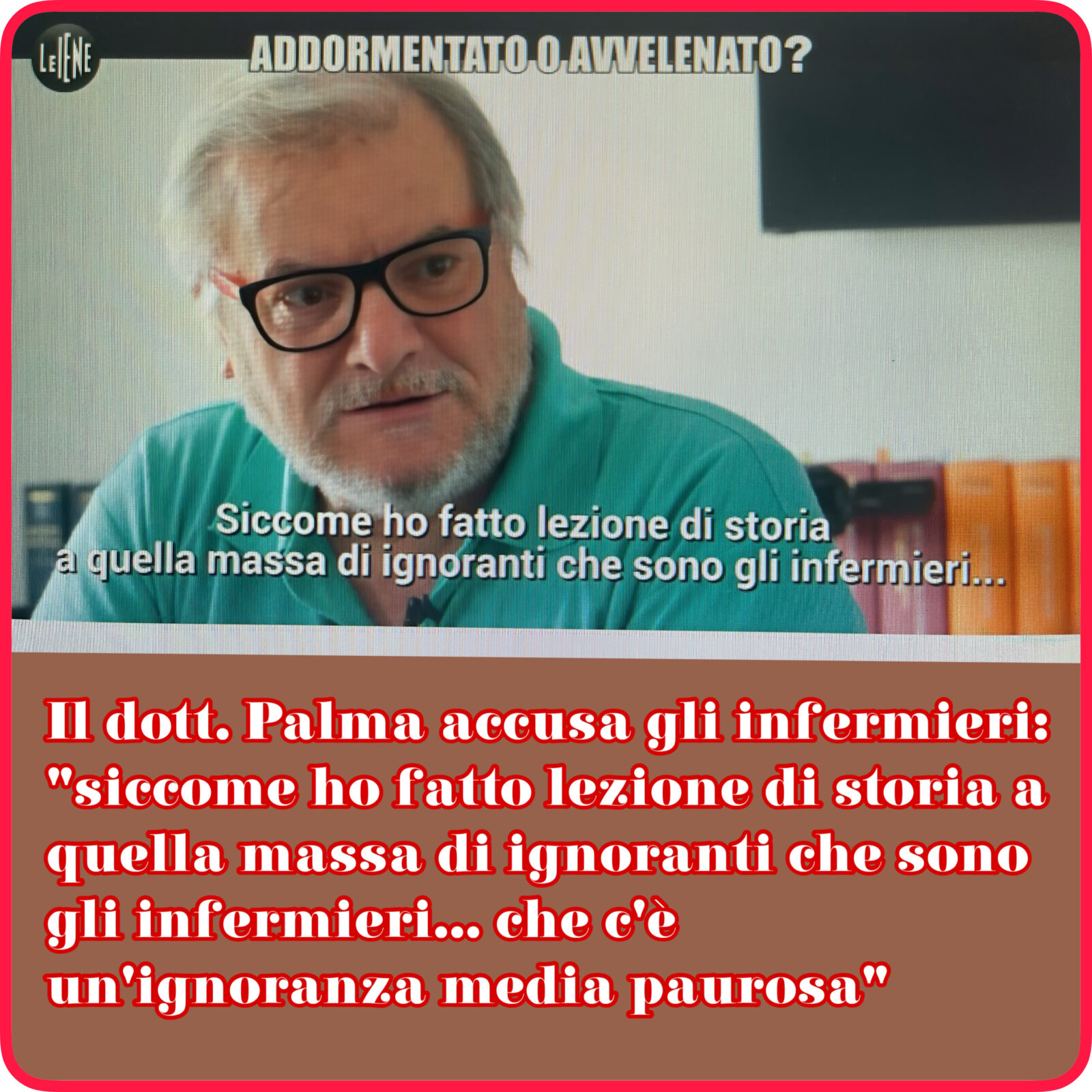 “Siccome – dichiara Palma – ho fatto lezione di storia a quella massa di ignoranti che sono gli infermieri… che c’è un’ignoranza media paurosa…” e li ha additati come responsabili di un presunto tentativo di avvelenamento a suo danno. Un attacco grave, che mina la credibilità di una categoria chiave per il servizio sanitario nazionale, già sotto pressione per carenze di organico e turni estenuanti.