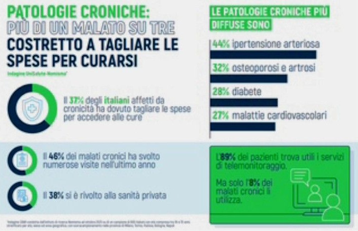 Sono anni che in Italia la speranza di vita alla nascita è in crescita, ma lo stesso non si può dire per gli anni di vita in buona salute. Sempre più cittadini si trovano infatti a convivere con patologie croniche e, per sostenere i costi legati al trattamento delle loro malattie, spesso sono costretti a fare delle rinunce. Lo rileva l’ultima indagine realizzata da Nomisma per l’Osservatorio Sanità* di UniSalute, secondo cui il 37% degli italiani affetti da patologie croniche ha rinunciato a vacanze, cene fuori o acquisti importanti negli ultimi 12 mesi.