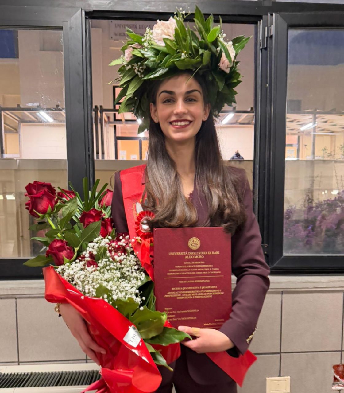 sono Maria Pia Gilda Paiano, neo laureata in infermieristica presso l’Università degli studi di Bari Aldo Moro. Invito i suoi lettori alla visione della mia tesi di laurea, intitolata “Ricerca quantitativa e qualitativa advocacy infermieristica in formazione e professione: analisi mista delle percezioni di competenza e preparazione”.