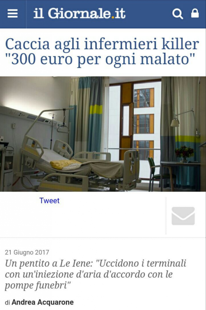 L’articolo a firma del giornalista Andrea Acquarone apre con un titolo roboante “Caccia agli infermieri killer – 300 euro – per ogni malato” tralasciando il fatto che sulle ambulanze private che trasportavano pazienti in fin di vita verso le abitazioni non vi fossero infermieri.