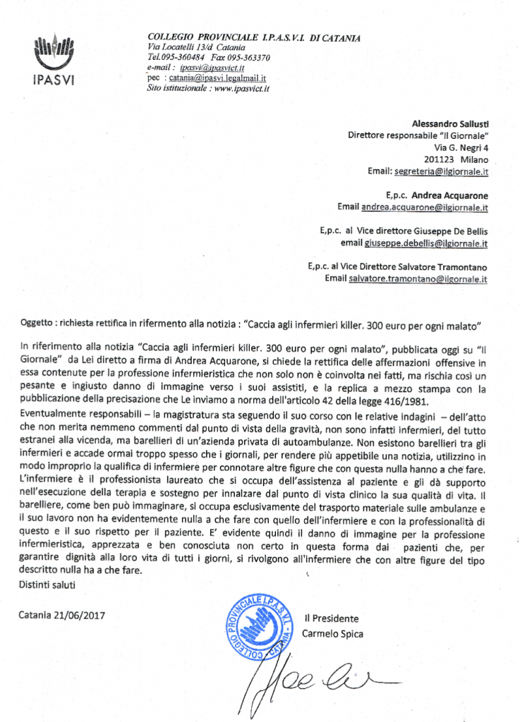 L’Ipasvi di Catania, per nome del presidente Carmelo Spica, ha scritto formalmente al Direttore del “Giornale”, Alessandro Sallusti chiedendo di rettificare quanto pubblicato dalla sua testata.