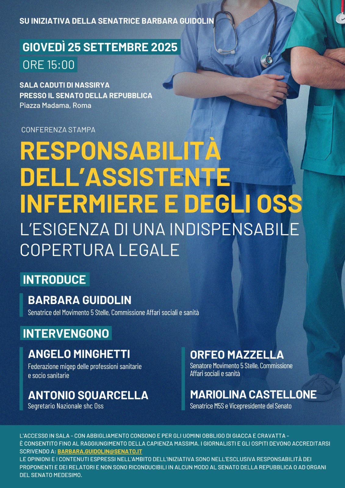 Domani 25 settembre, presso il Senato della Repubblica, si terrà un incontro di fondamentale importanza dedicato al tema della responsabilità e del riconoscimento giuridico dell’Assistente Infermiere e dell’Operatore Socio Sanitario (OSS).