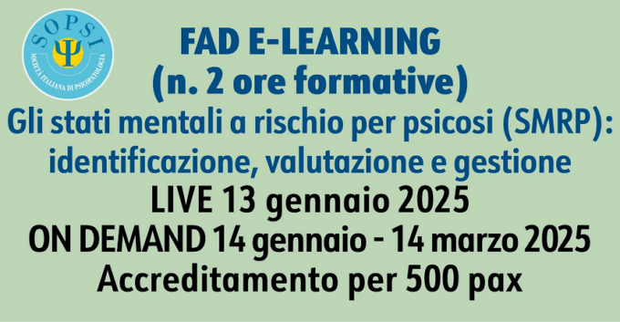 La Scoietà italiana di psicopatologia (Sopsi) propone il corso Ecm Fad gratuito “Gli stati mentali a rischio per psicosi (SMRP): identificazione, valutazione e...