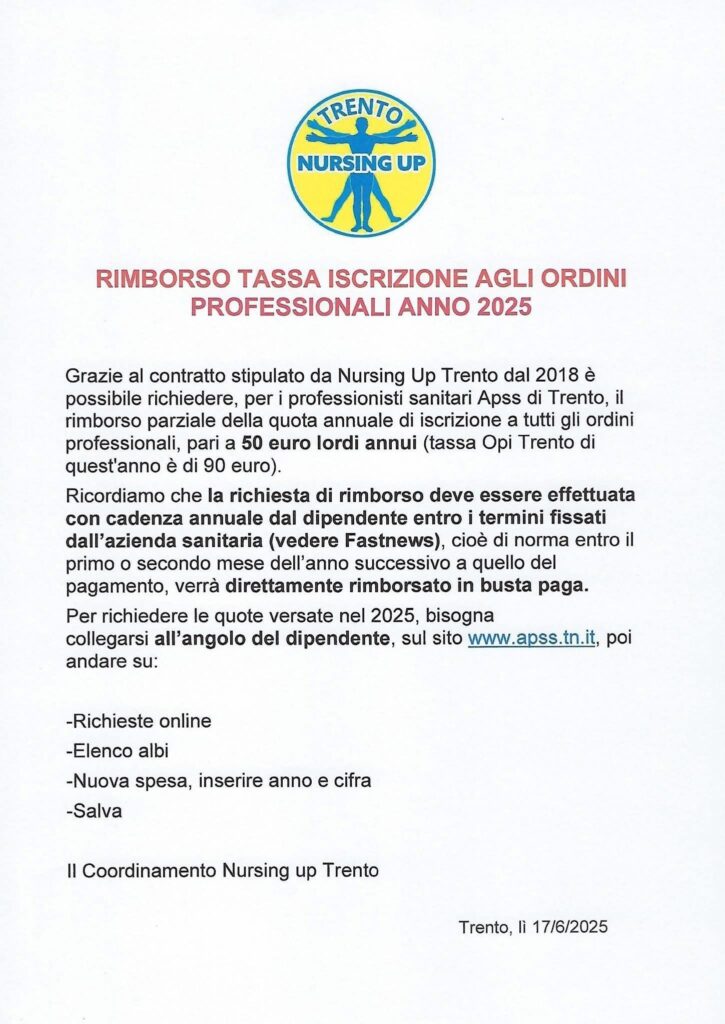 Per l’anno 2025 i professionisti sanitari dipendenti dell’Azienda Provinciale per i Servizi Sanitari (APSS) di Trento possono chiedere il rimborso parziale della quota annuale di iscrizione agli ordini professionali — €50 — grazie ad un accordo negoziale portato avanti da Nursing Up Trento a partire dal 2018. Questa misura interessa in modo particolare gli infermieri, categoria che più di altre sopporta oneri legati all’iscrizione obbligatoria all’Albo professionale.