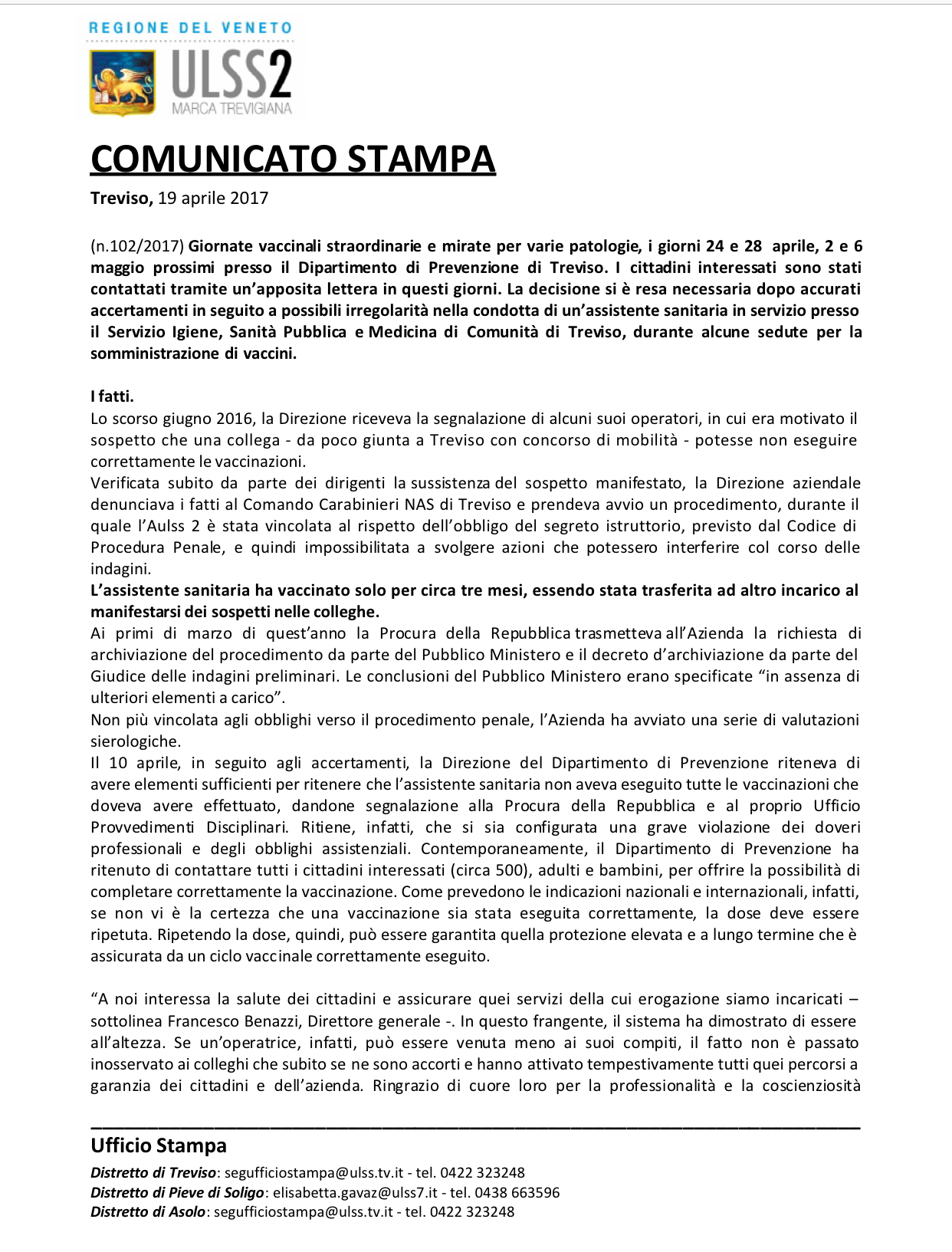 La Direzione Sanitaria ha immediatamente preso i provvedimenti del caso richiamando personalmente oltre 500 bambini che potrebbero non essere stati vaccinati, facendo scattare l’indagine interna nei confronti dell’Infermiera.